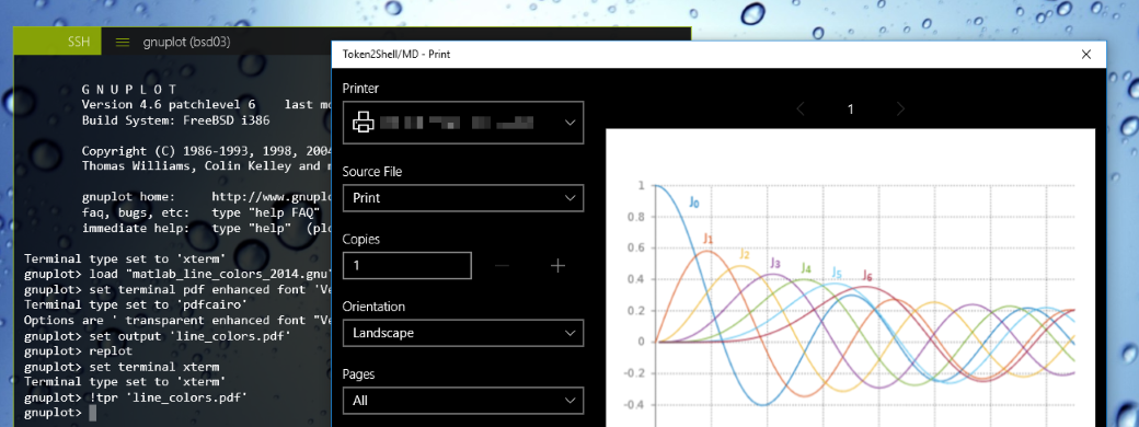 Token2Shell also includes local network printing mode and using that with Direct File Printing, you can transparently have a remote file printed on your local network printer. For example, if your local network printer accepts PostScript and your server can generate its output in the same format, you simply need to save your output as a PostScript file and send it over Direct File Printing whenever you need to print.